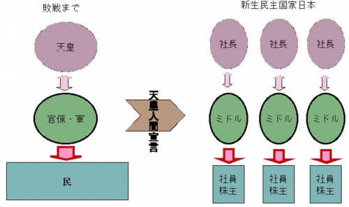 繰り返しになりますが、「どうして旧日本型組織には、全員が逆らいがたい、ある空気が醸成されるのか」ということを整理しますと、270年間の徳川の暗黒時代があって、みんな幕府に依存していたわけですが、近代日本が幕藩体制を超克して統一を果たすために、依存の対象を天皇に変えたわけです。